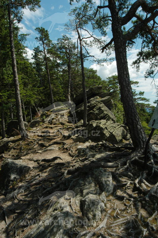 Opevnění. Hradiště je opevněno valem bez příkopu v délce 920 m. Ohrazená plocha má tvar protáhlého oválu o délce cca 400 m a šířce 32-114 m a kopíruje sedlovitý tvar vrcholu hory. Při stavbě opevnění bylo využito přirozených sklaních stěn, které byly do opevnění hradiště začleněny. Z vnější strany dosahují valy výšky až 10 m, z vnitřní strany 1-1,5 m, maximální šířka valu činí 13 m. Hradba byla postavena patrně z nasucho kladených kamenů s vnitřní dřevěnou konstrukcí. Akropole je situována na jihovýchodní straně na nejvyšším bodě ohrazené plochy. Původní vstup do hradiště se nacházel na jihovýchodní straně. Ulicovitá brána měla délku 17 m a šířku 1,5 m.